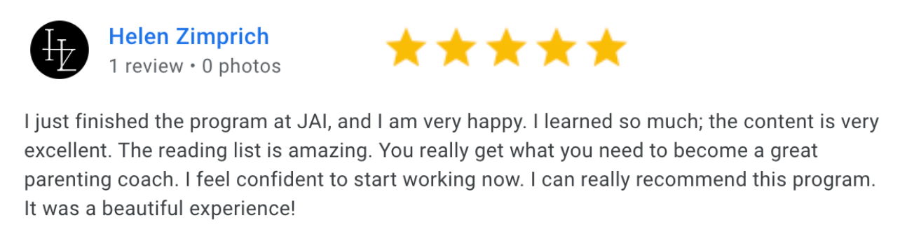 If you are not 100% satisfied with your decision, we will fully refund your tuition within the first 30 days of starting your cohort after completing an exit interview with our Director of Client Services. This allows us to live up to our commitment to “always be improving.” Please notify us within the guarantee period by emailing support@jaiinstituteforparenting.com to request your exit interview.